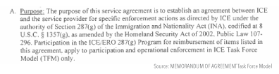 En virtud del programa 287(g), el ICE afirma que puede delegar en determinados empleados de organismos estatales y locales, normalmente de las fuerzas del orden, la autoridad para actuar como funcionarios federales de inmigración independientes en virtud de ese acuerdo. Estas funciones se llevan a cabo con una supervisión limitada del ICE, y con 40 horas o menos de formación en línea sobre la ley de inmigración y su aplicación. Un acuerdo 287(g) sólo se aplica a los empleados específicos que han sido nombrados, formados, aprobado un examen y, a continuación, certificados por el ICE.