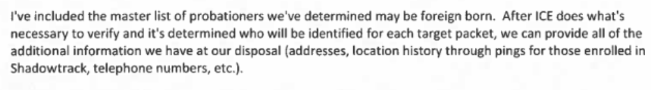 Por ejemplo, los documentos que recibimos del Departamento de Instituciones Penitenciarias muestran que se pasa información no sólo sobre los inmigrantes que pueden no tener estatuto permanente, sino también sobre las personas que «pueden haber nacido en el extranjero», incluidos los ciudadanos estadounidenses.