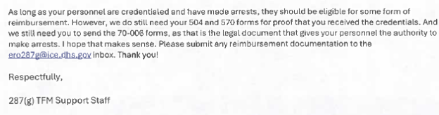 Desde noviembre de 2025, muchas agencias del modelo TF han firmado un segundo «acuerdo de servicio» para recibir el reembolso por el tiempo que dedican. Cada agencia debe presentar una hoja de trabajo al ICE cada mes, detallando el tiempo y las actividades que dedicaron a la aplicación de la ley de inmigración en lugar de llevar a cabo su misión de seguridad pública. Esto ya ha dado lugar a que algunas detenciones civiles por inmigración las realicen directamente las fuerzas de seguridad locales, sin dirección ni supervisión del ICE.