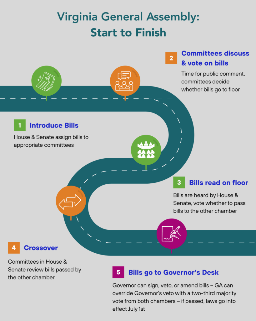 While there may be many changes along the way, here is a basic overview of the legislative process in Virginia: