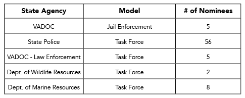 Virginia State Police, Virginia Department of Corrections, Virginia Department of Fish and Wildlife, Virginia Department of Marine Resources.