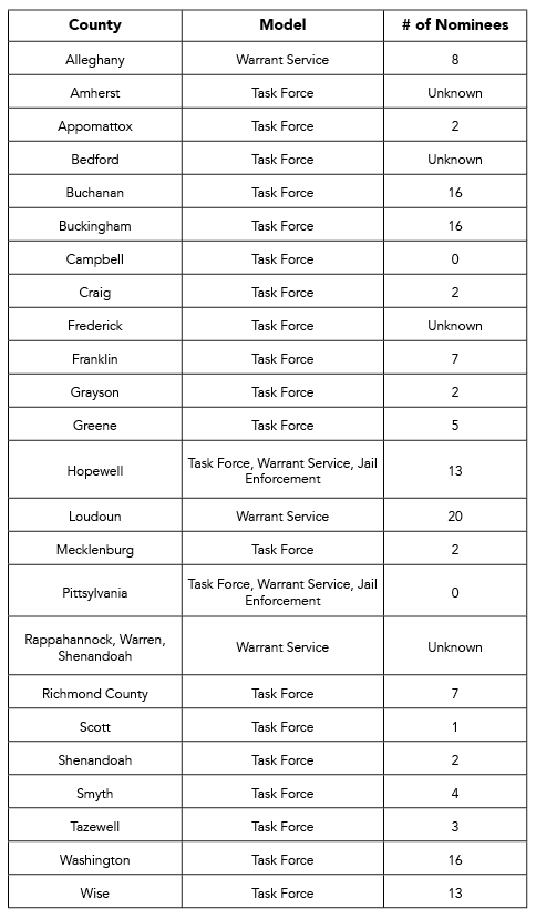 3 Jail Enforcement Models – 6 Warrant Service Officer Models – 24 Task Force Models
